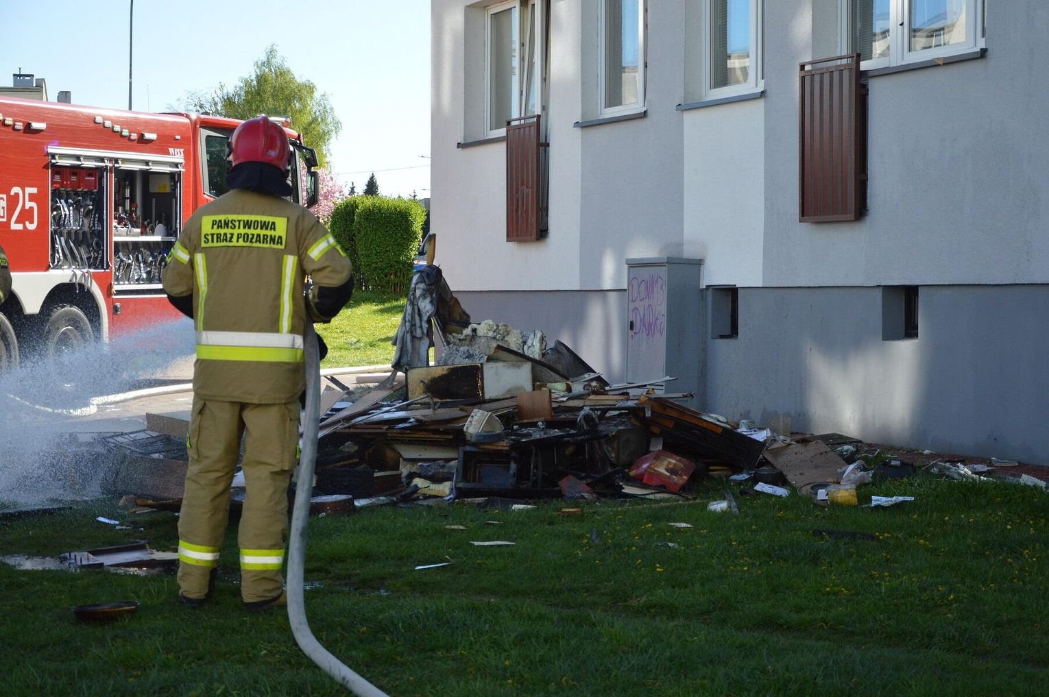 Strażacy szybko opanowali ogień, a obecnie trwa wynoszenie nadpalonych i zniszczonych elementów wyposażenia z mieszkania, w którym doszło do pożaru. Mieszkańcy zostali ewakuowani na czas prowadzenia akcji, a zastępy straży pożarnej sukcesywnie wracają do swoich jednostek.