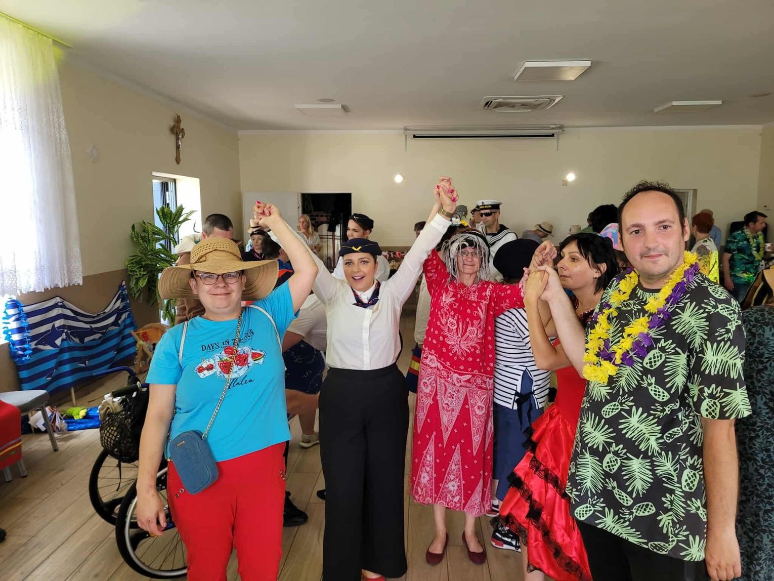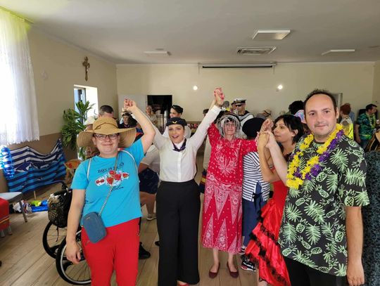 Terapeutki z Kleszczewa Kościerskiego tym razem stanowiły zgodny team stewardes. I zabrały uczestników spotkania w wakacyjny lot. Na pokładzie powitała wszystkich Marta Burczyk, kierownik ŚDS w Kleszczewie Kościerskim.