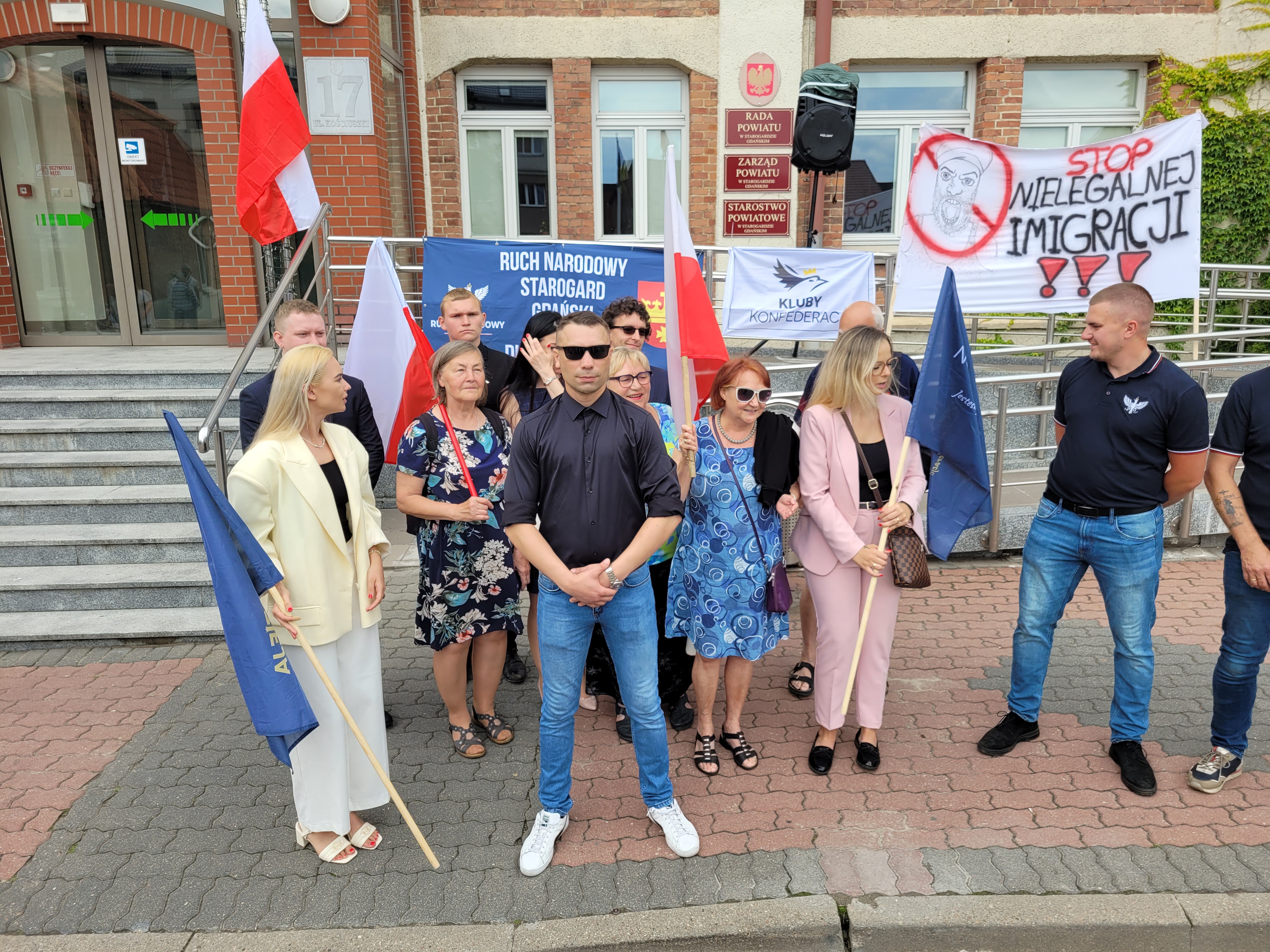 Niemcy „dzielą się” swoim problemem z sąsiadami (nie tylko z Polakami!), wykorzystując bezczelnie swą silna pozycję w Unii europejskiej (de facto niemieckiej…). Nie wolno im na to pozwolić. Ostatnie przypadki zabójstw dokonanych w Polsce przez „uchodźców” oraz unijne „kontyngenty” (tysiące imigrantów do obowiązkowego osiedlenia w Polsce!), ustalone dla wszystkich państw Unii, ciche porozumienie w tej sprawie między Donaldem Tuskiem i kanclerzem Niemiec – każą nam przystąpić do działania. Powstał Ruch Obrony Granic, na który środowisko Tuska i Bodnara wylewa wiadra pomyj, powstają lokalne inicjatywy monitorowania nieodpowiedzialnych często samorządowców, którzy wykonują polecenia partyjne i przygotowują „uchodźców” do osiedlenia na swoim terenie. Stąd się wzięła ostatnia akcja protestacyjna. Kiedy szedłem na protest w Starogardzie, pod gmach Starostwa Powiatowego, nie spodziewałem się, że będzie nas tam około 500 osób! W 90% młodzi ludzie! Przedstawiciele Ruchu Narodowego, Konfederacji, radni Prawa i Sprawiedliwości, mieszkańcy Starogardu, powiatu, także przyjezdni z innych miast. Wyróżniali się aktywnością i pomysłowymi okrzykami kibice Lechii Gdańsk.