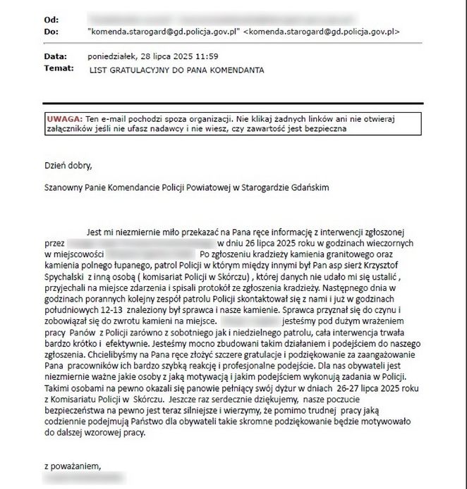 Autorka maila wyraziła ogromne uznanie dla pracy policjantów z obu patroli – zarówno sobotniego, jak i niedzielnego. Podkreśliła, że cała interwencja przebiegła niezwykle szybko i efektywnie, a profesjonalizm i zaangażowanie funkcjonariuszy budzą podziw.