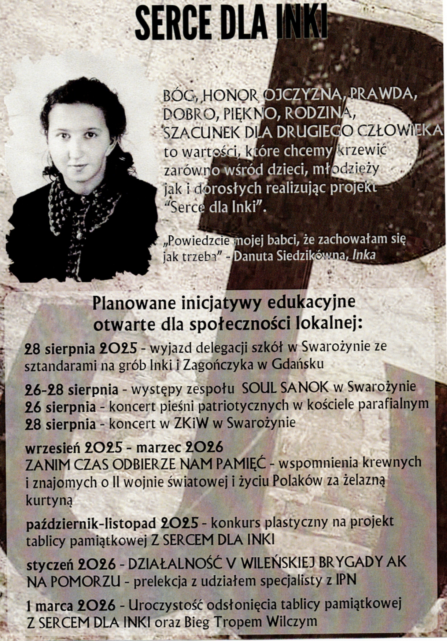 Warto podkreślić, że animatorką całej akcji, której finałem będzie poświęcenie Serca dla „Inki” 1 marca 2026 roku, jest nauczycielka historii w Zespole Kształcenia i Wychowania – Anna Krykowska – która od lat imponuje rodzicom dzieci i mieszkańcom Swarożyna pięknymi inicjatywami na polu patriotycznej edukacji dzieci i dorosłych. Pani Anna cieszy się wsparciem swych działań wśród nauczycieli i dyrekcji szkoły oraz poparciem ks. proboszcza Piotra Malinowskiego.