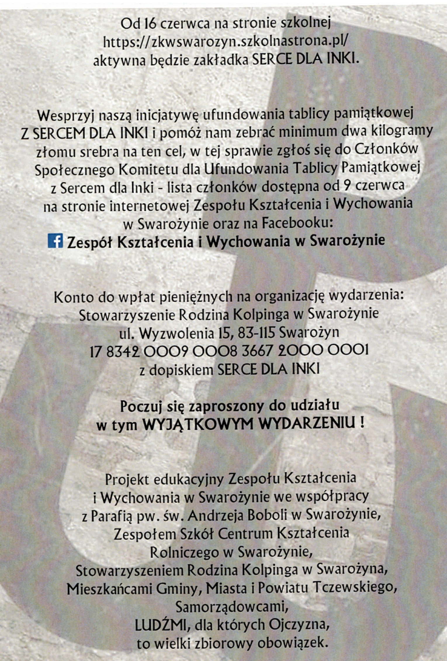 W Swarożynie, w powiecie tczewskim, zawiązała się silna koalicja patriotów na rzecz ufundowania i poświęcenia Serca dla „Inki” w miejscowym kościele pod wezwanie św. Andrzeja Boboli, Patrona Polski. Odbyły się już dwa spotkania, jedno z udziałem ks. Wąsowicza. Ostatecznie ustalono, że: