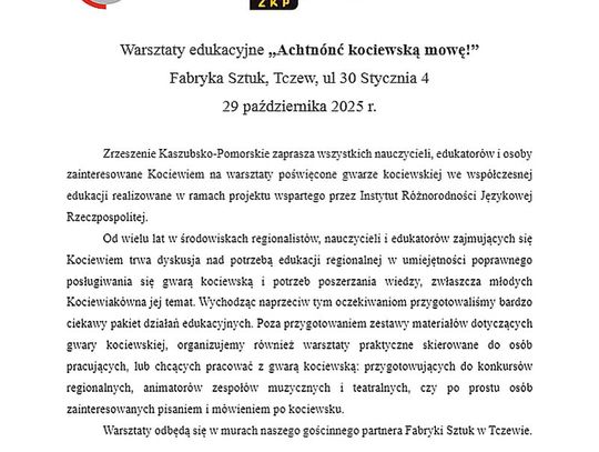 Zrzeszenie Kaszubsko-Pomorskie zaprasza wszystkich nauczycieli, edukatorów i osoby zainteresowane Kociewiem na warsztaty poświęcone gwarze kociewskiej we współczesnej edukacji, realizowane w ramach projektu wspartego przez Instytut Różnorodności Językowej Rzeczpospolitej.
