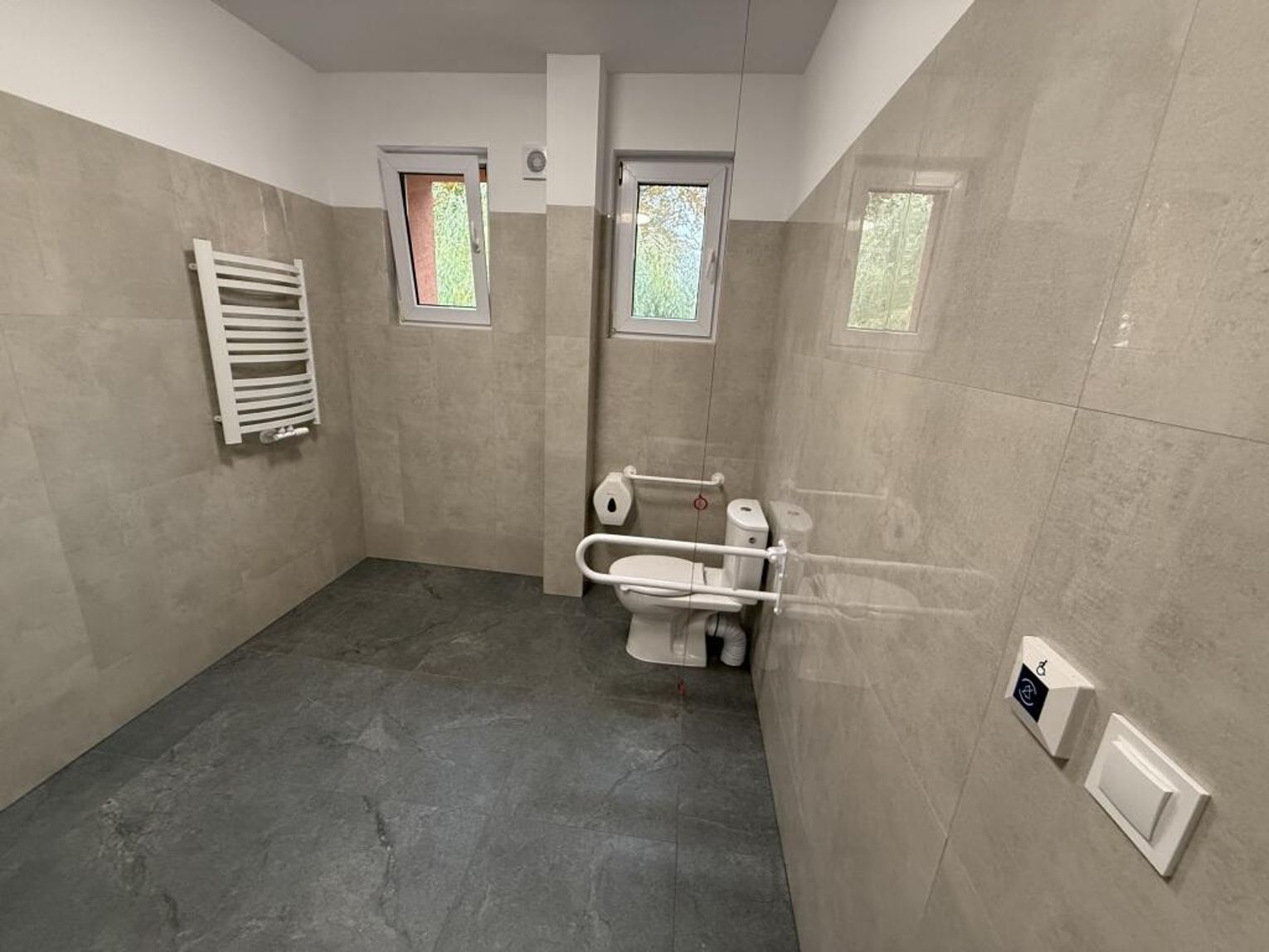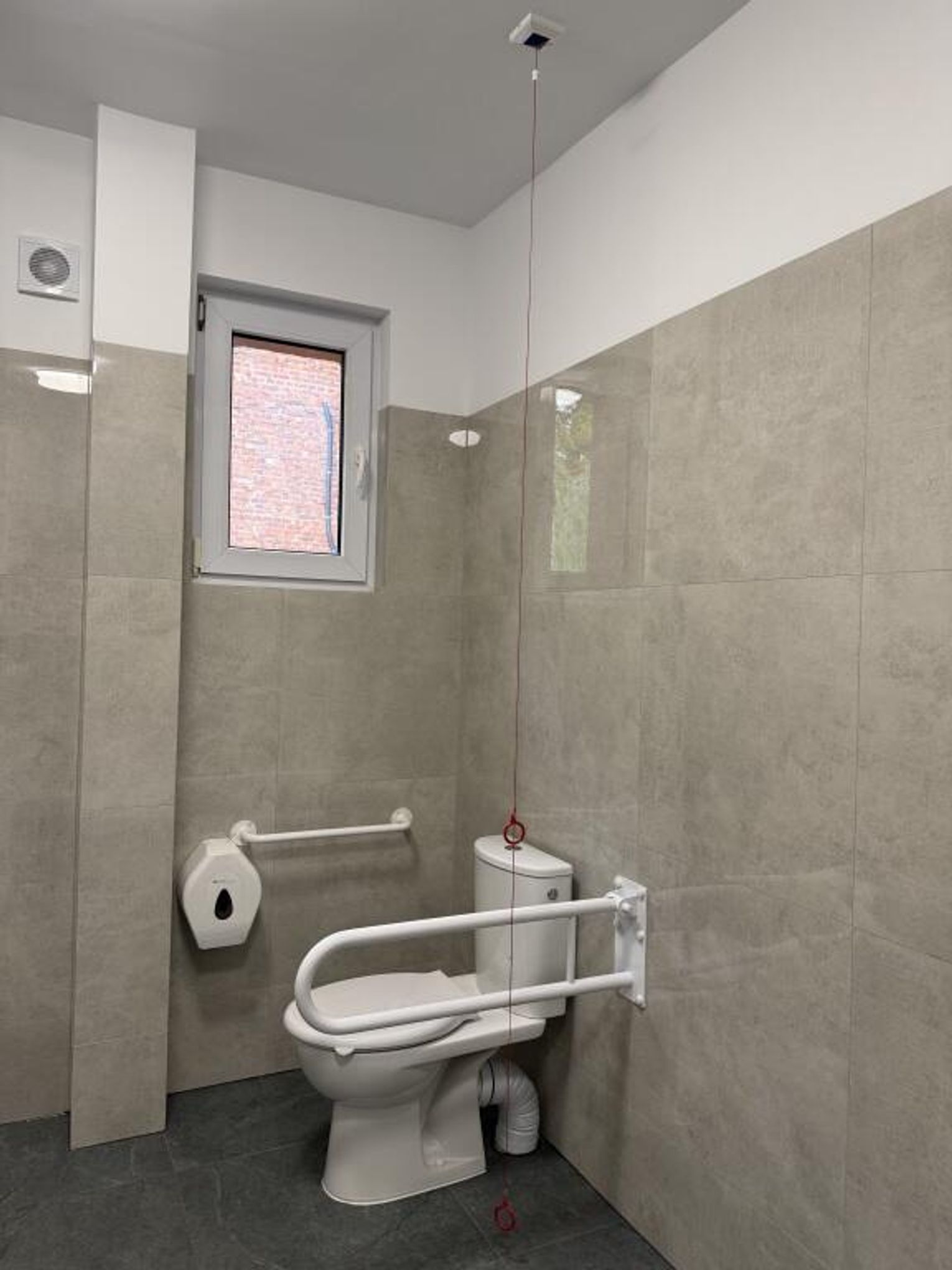 Toaleta została wykonana zgodnie z obowiązującymi wytycznymi i przepisami, określającymi m.in. odpowiednie wymiary, wysokość montażu urządzeń sanitarnych, niezbędną przestrzeń manewrową oraz wyposażenie – w tym stabilne uchwyty, dzwonek alarmowy i antypoślizgową podłogę.