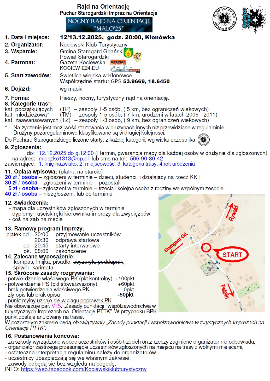 Miłośnicy nocnych wyzwań i pieszych wędrówek z mapą w dłoni znów spotkają się na starcie! Już w nocy z 12 na 13 grudnia 2025 r. w Klonówce odbędzie się kolejna edycja Nocnego Rajdu na Orientację „Mało25” – wydarzenia w ramach Pucharu Starogardzkich Imprez na Orientację. Uczestnicy, startujący indywidualnie lub w zespołach, zmierzą się z trasami o zróżnicowanym stopniu trudności, przemierzając nocą lasy i okolice Klonówki. Organizator – Kociewski Klub Turystyczny – zapowiada świetną atmosferę, sportowe emocje i satysfakcję z pokonania własnych słabości. Start zaplanowano na godzinę 20.00 ze świetlicy wiejskiej w Klonówce. To propozycja dla tych, którzy lubią aktywność, przygodę i dobrą zabawę nawet po zmroku!