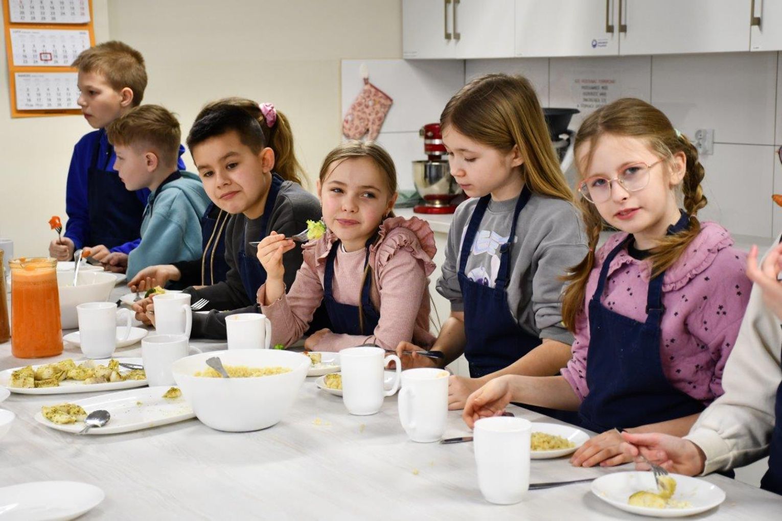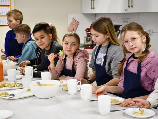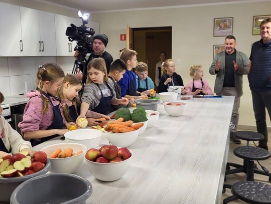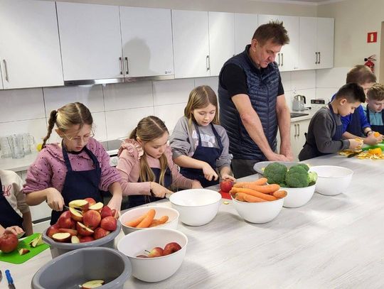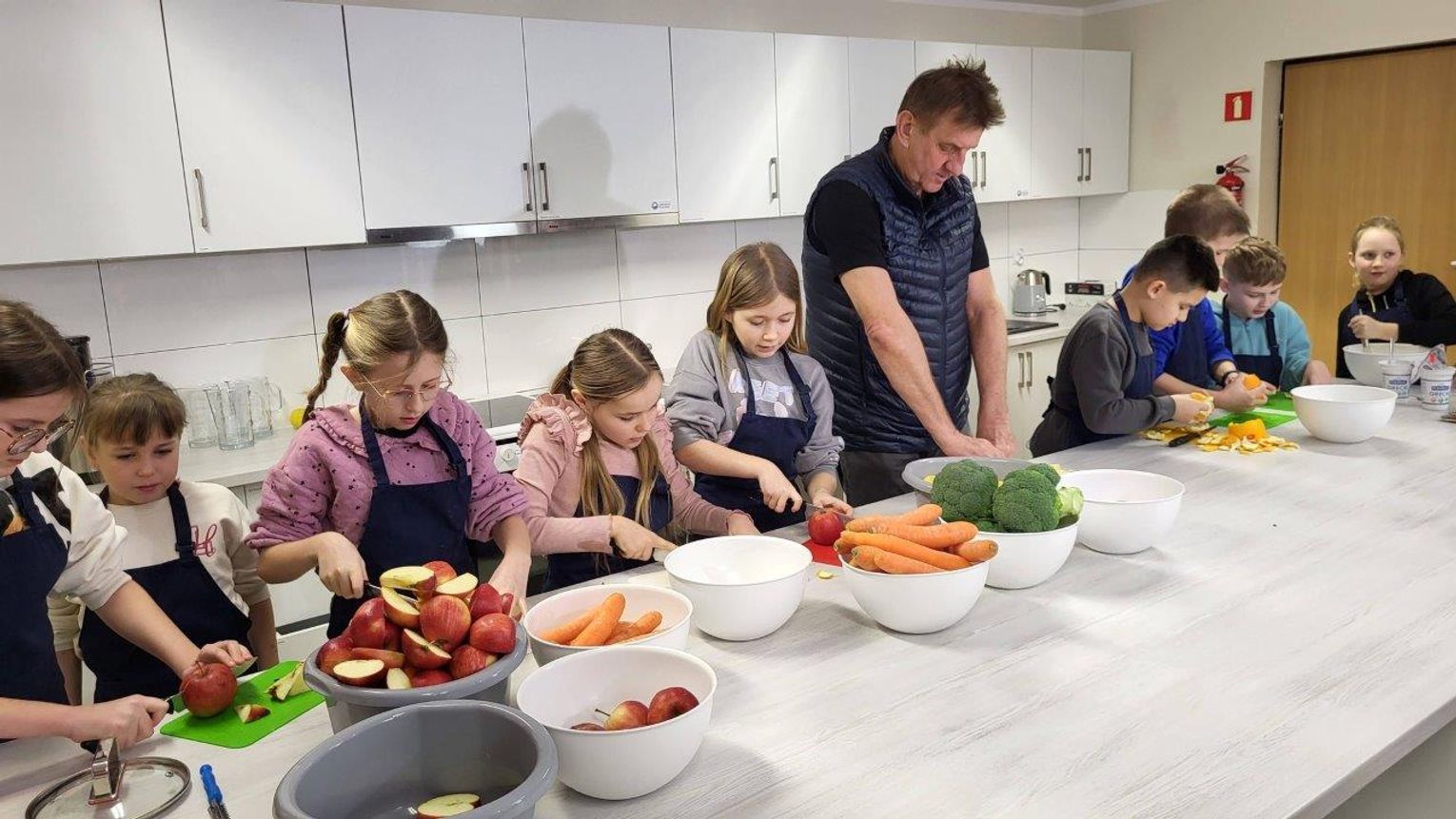 Po spotkaniu – czas na wspólne gotowanie w bytońskiej pracowni kulinarnej! Jak się okazało, Marek Kamiński bardzo lubi gotować. Z radością gotował więc wraz z dziećmi z kl.III a i IV oraz z nauczycielkami – Justyną Mokwą i Natalią Formellą. A wszystko to w ramach szkolnego projektu „Gotowanie z …” . Wspólnie przygotowano i serwowano danie specjalne czyli „talerz podróżnika”. Znalazła się na nim morska ryba, brązowy ryż, warzywa gotowane na parze i sok warzywno-owocowy. Wspólne gotowanie wyszło fantastycznie!