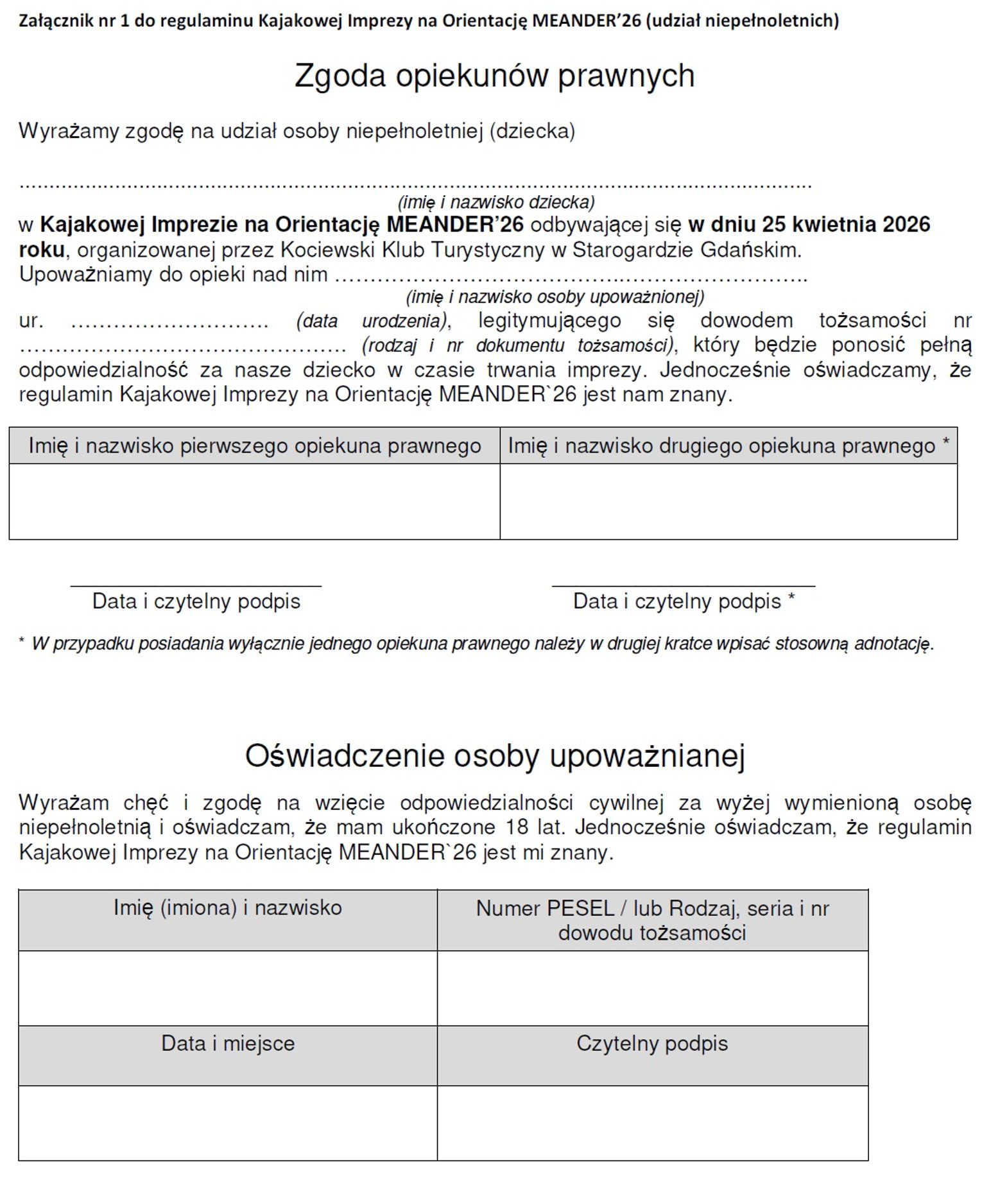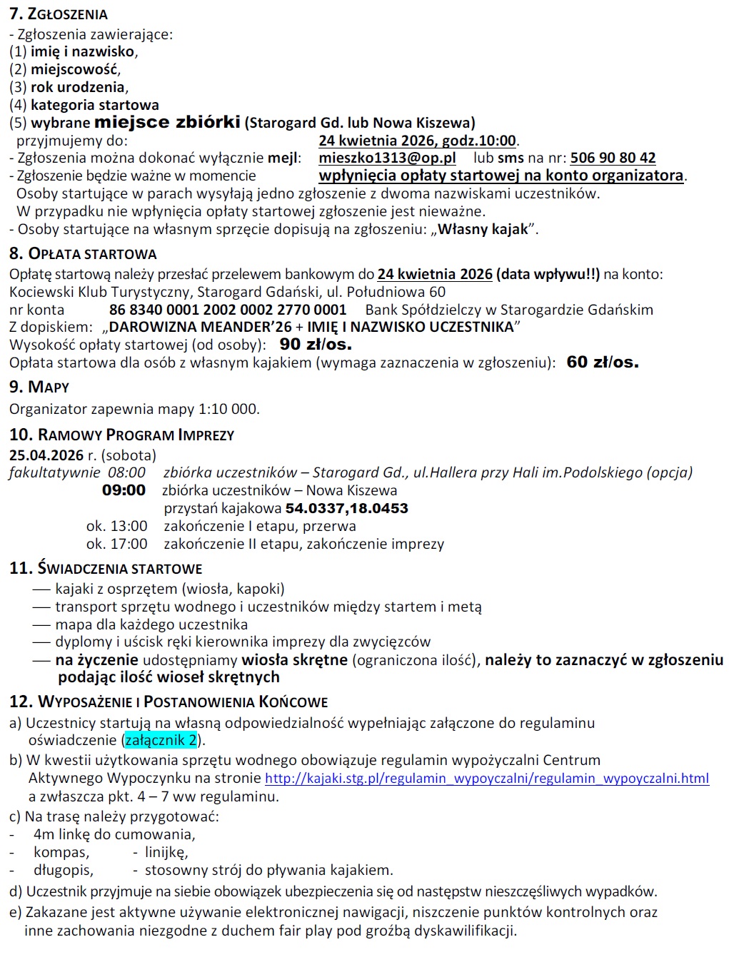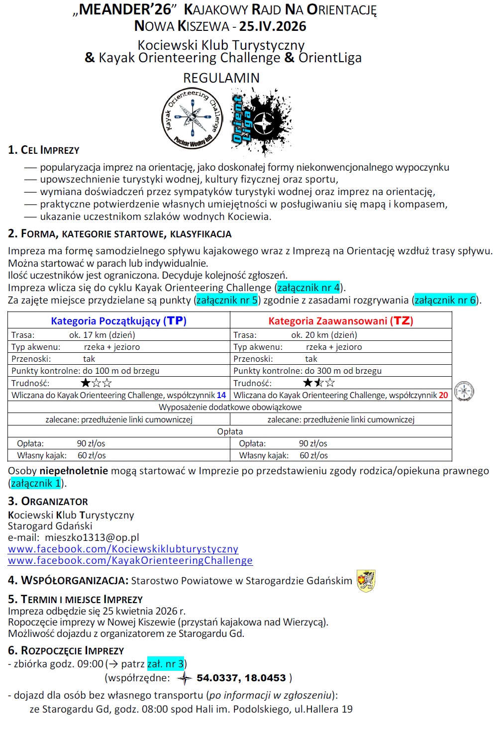 Miłośnicy aktywnego wypoczynku i kajakarstwa będą mieli okazję sprawdzić swoje umiejętności podczas MEANDER’26 – Kajakowego Rajdu na Orientację. Wydarzenie odbędzie się w sobotę, 25 kwietnia 2026 roku w Nowej Kiszewie i zaoferuje dwie trasy o różnym stopniu trudności – dla początkujących (17 km) oraz zaawansowanych (20 km). Uczestnicy zmierzą się nie tylko z dystansem, ale także zadaniami nawigacyjnymi, a na miejscu organizatorzy zapewnią sprzęt, mapy oraz zaplecze logistyczne.