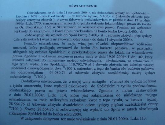 - Pomimo niewpłacenia tej kwoty do kasy Sp-ni, z konta Sp-ni przekazałam na konto banku kwotę 5400 zł – czytamy w oświadczeniu radnej. – Zobowiązuję się wpłacić do Sp-ni kwotę 5400 zł wraz z ustawowymi odsetkami do dnia 31 stycznia 2004r. Ponadto oświadczam, że moją winą jest również nieprawidłowe wyliczenie umorzeń, które podlegają zwrotowi do banku /do budżetu państwa/, w przypadku ubiegania się członka Spółdzielni o przekształcenie prawa do lokalu na własnościowe prawo – czytamy dalej w oświadczeniu.