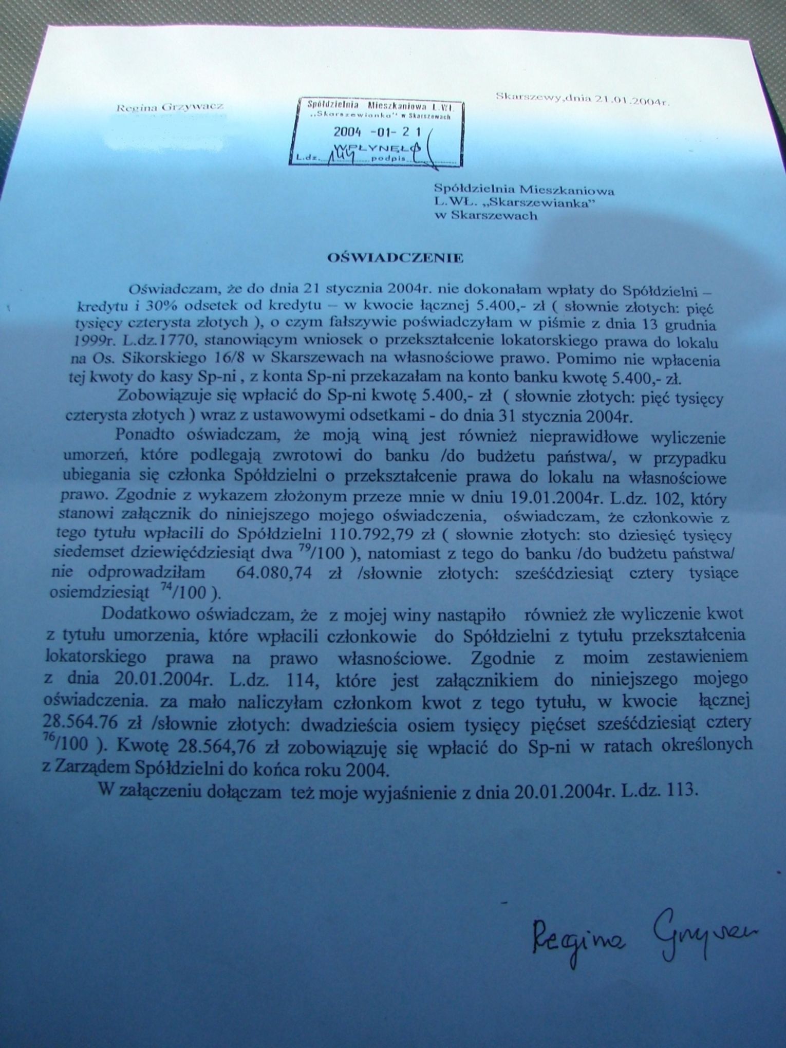 Chodziło o kwotę 28.564.76 zł. Wszystkie powyższe sumy Regina Grzywacz zobowiązała się w swym w oświadczeniu wpłacić na konto Spółdzielni do końca roku 2004.