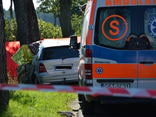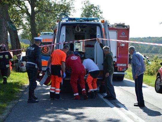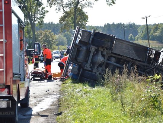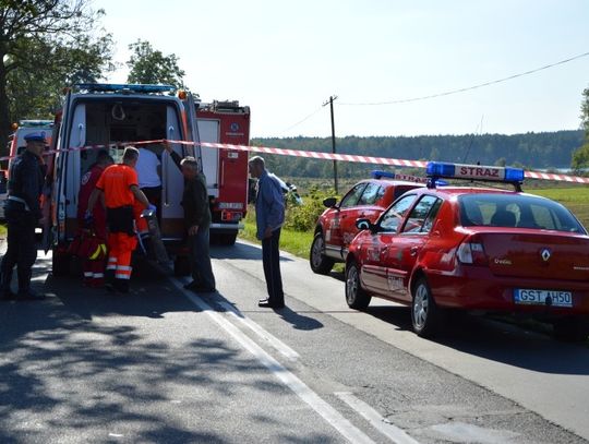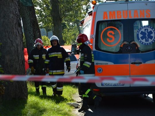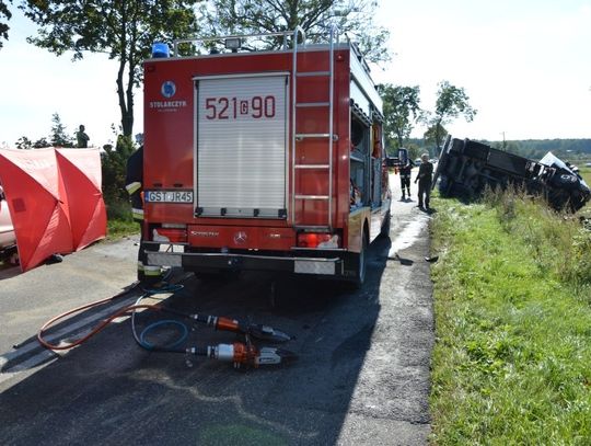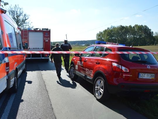 Na miejscu pracują służby ratunkowe, straż oraz policja. Droga jest zablokowana.