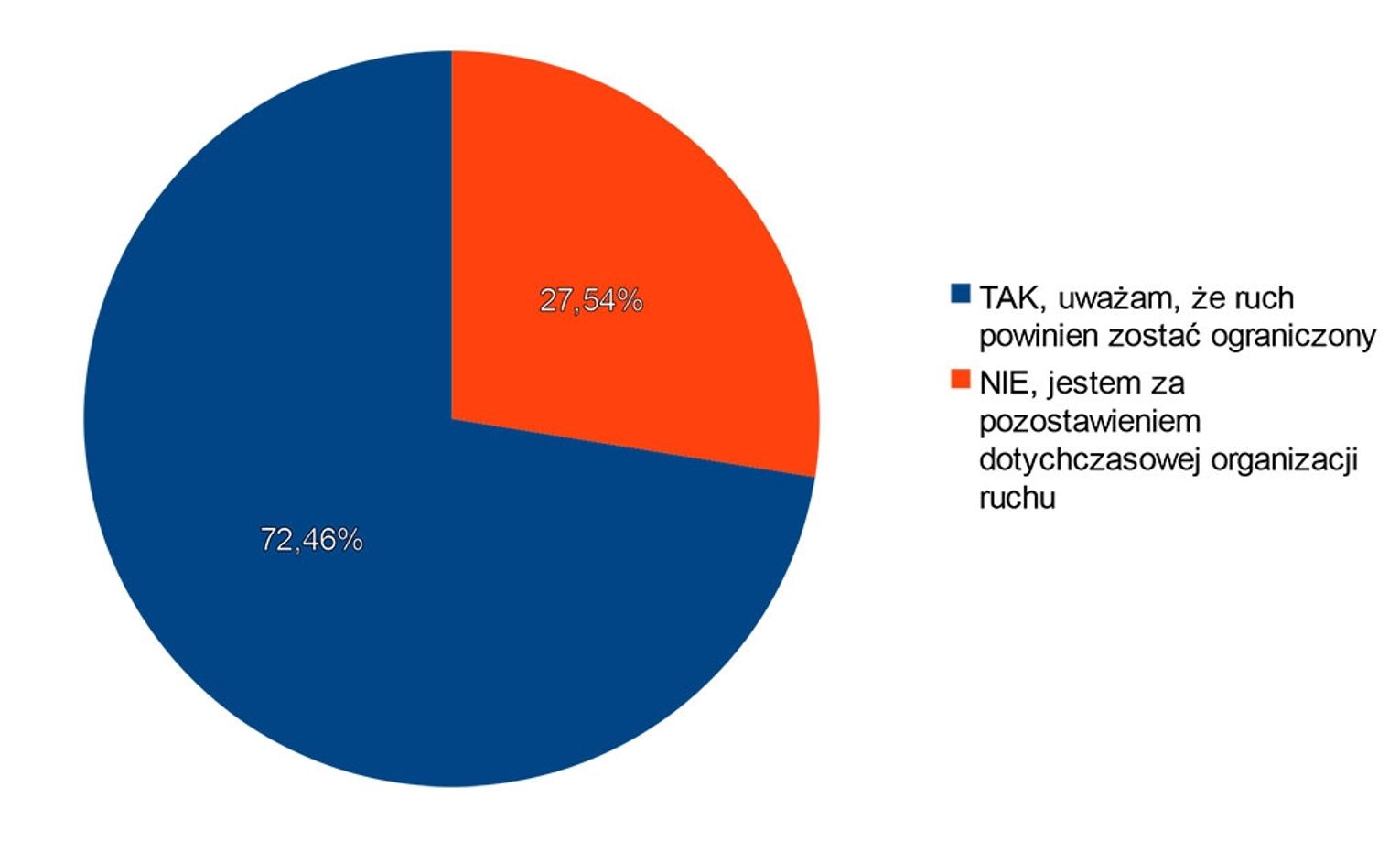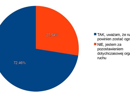 W odpowiedzi na pierwsze pytanie większość, bo aż 1 839 mieszkańców była za tym, aby ruch samochodowy został ograniczony, tylko 699 osób odpowiedziało: „Nie, jestem za pozostawieniem dotychczasowej organizacji ruch.”