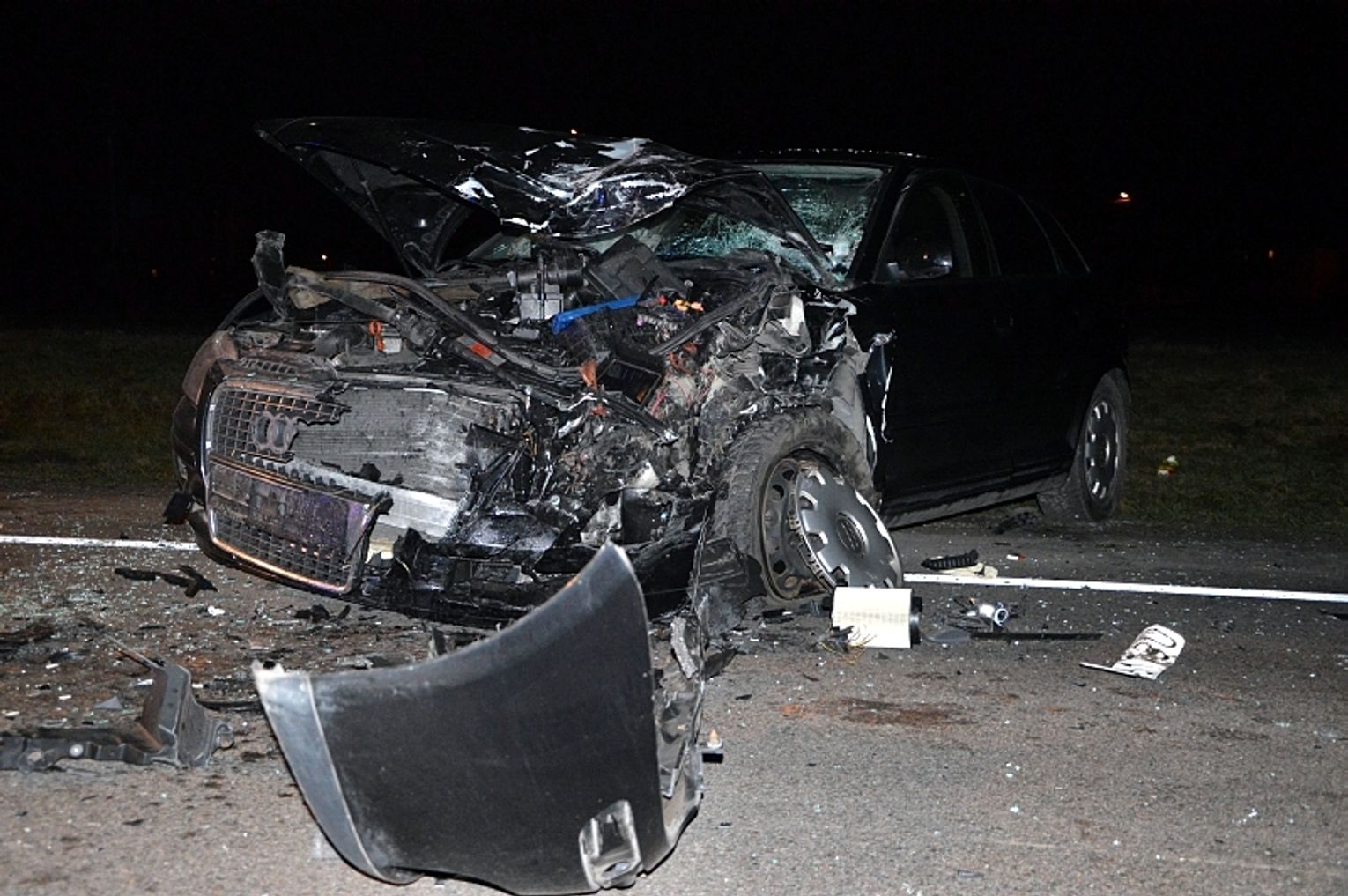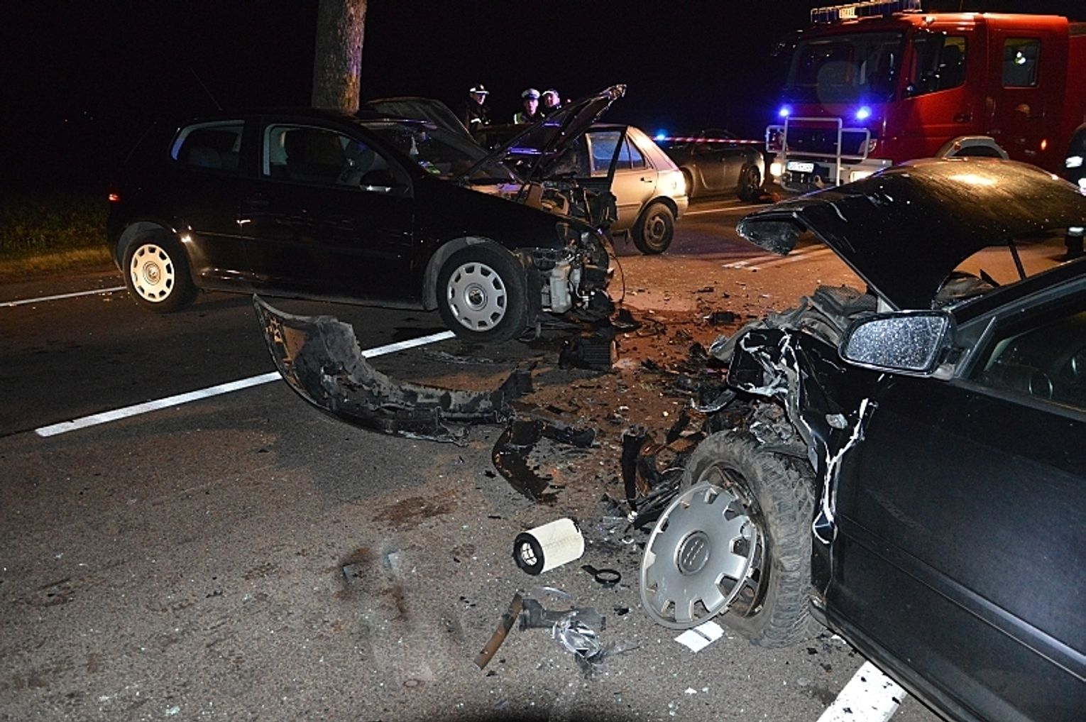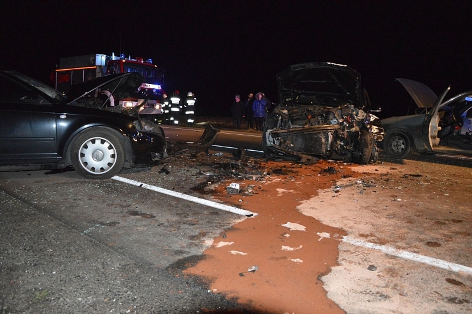 - Do naszej jednostki wpłynęło zgłoszenie o wypadku na drodze krajowej nr 22, pomiędzy Bytonią z Zblewem – relacjonuje kpt. Karina Stankowska, rzeczniczka prasowa KP PSP w Starogardzie Gd. - Dyżurny skierował na miejsce dwa zastępy z OSP Zblewo, zastęp gaśniczy z JRG Starogard Gd. Jak się okazało na miejscu zderzyły się trzy samochody osobowe, volkswagen golf, audi i ford fiesta. Nasze działania polegały na zabezpieczeniu miejsca wypadku, odłączeniu zasilania akumulatorowego i oświetleniu terenu działań. Ruch odbywa się wahadłowo. Przejazd możliwy jest tylko dla samochodów osobowych. Auta ciężarowe muszą poczekać na poboczu. W zderzeniu brało udział 7 osób, z czego 4 zostały ranne. ZRM udzielił poszkodowanym pierwszej pomocy, następnie poszkodowani zostali przewiezieni do szpitala. Na miejscu trwają czynności dochodzeniowe – dodaje kpt. Karina Stankowska.