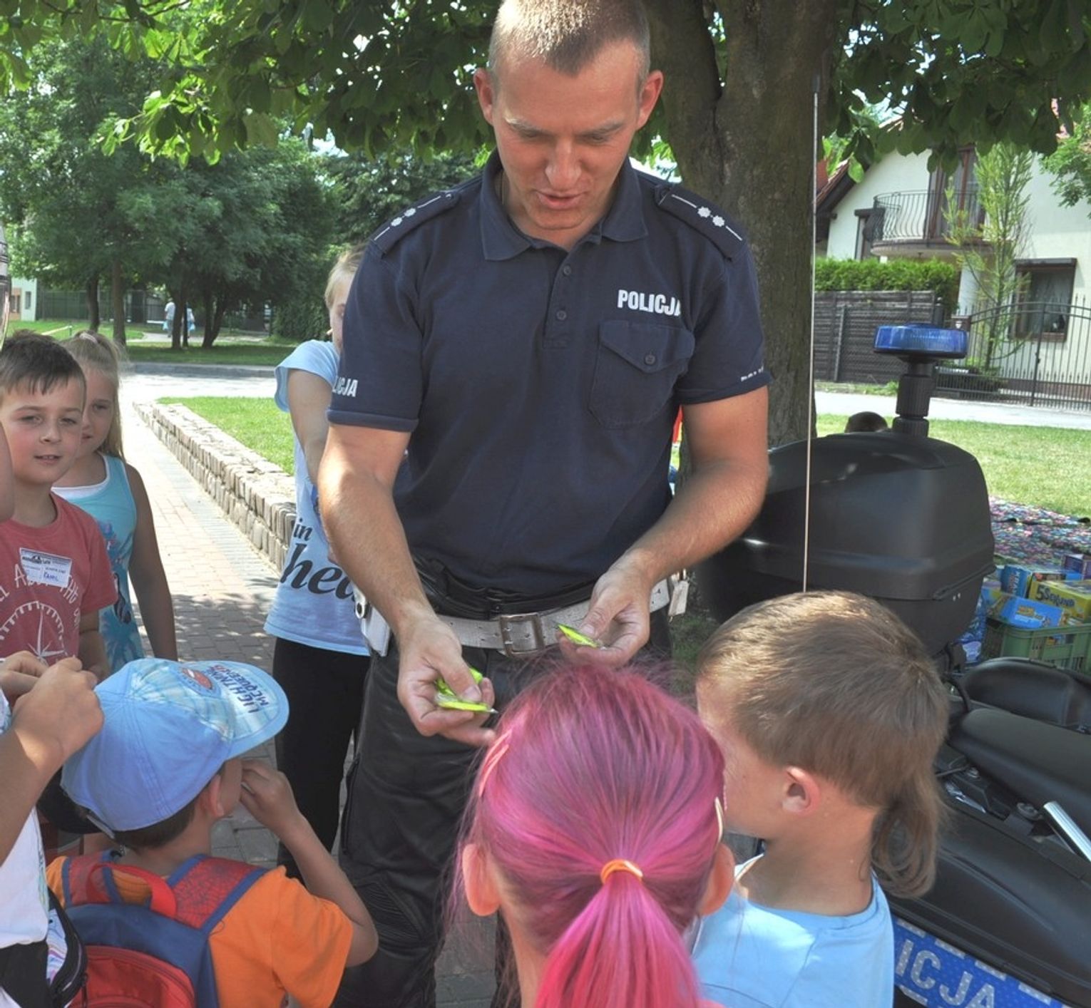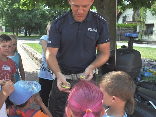 Wczoraj przed budynkiem Spółdzielczego Domu Kultury odbyło się jedno z takich spotkań. Była to doskonała okazja do utrwalenia przepisów ruchu drogowego. Policjanci przypominali o tym jak bezpiecznie przechodzić przez jezdnię i poruszać się rowerem. Funkcjonariusze informowali najmłodszych o zasadach bezpiecznego wypoczynku oraz ostrzegali o konsekwencjach niewłaściwych zachowań na kąpieliskach oraz jak zachowywać się w domu podczas nieobecności dorosłych i jak bezpiecznie bawić się na placach zabaw. W spotkaniu uczestniczył także mundurowy z drogówki, który zaprezentował motocykl policyjny.