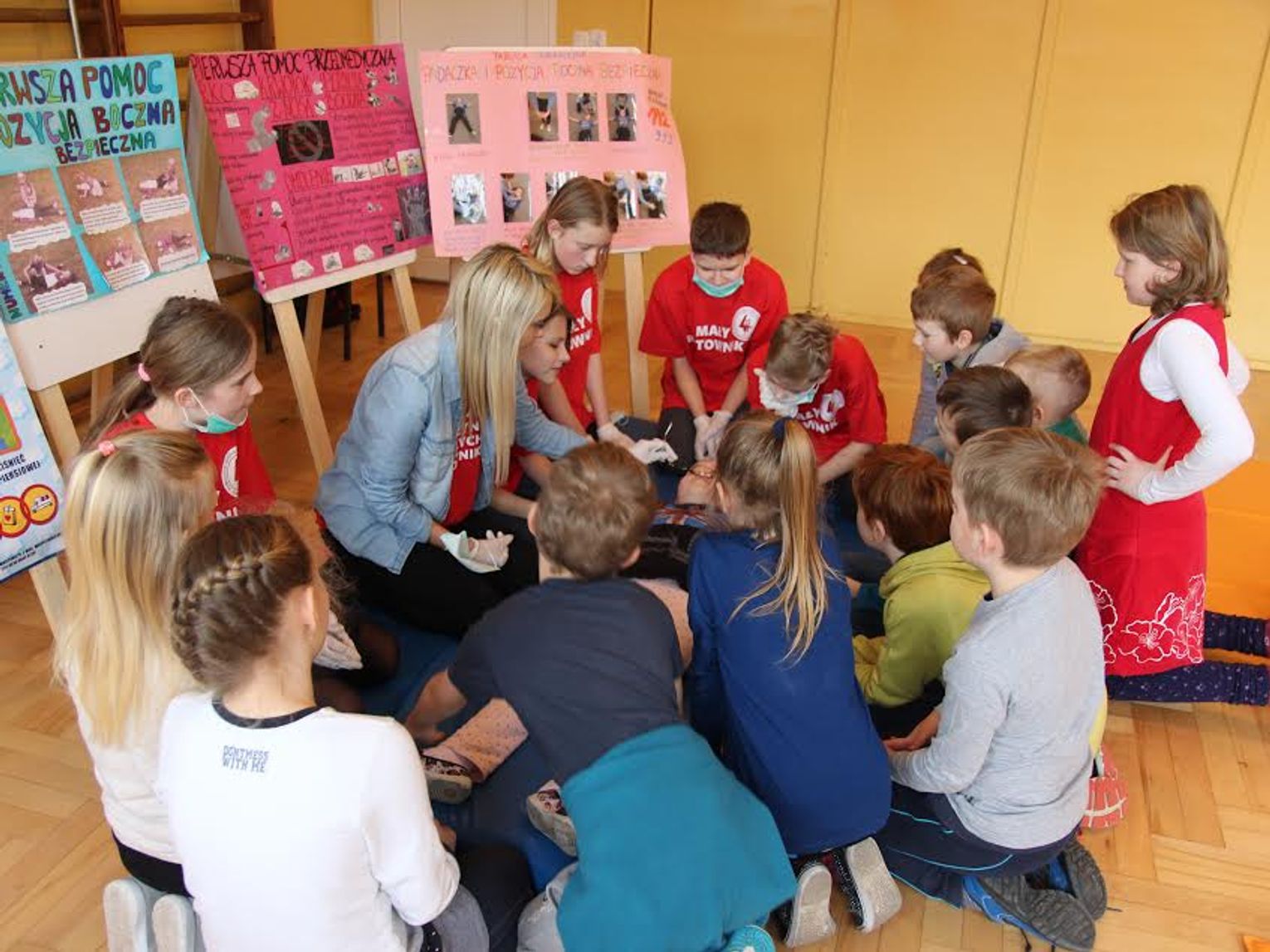Uczniowie klas I-VI oraz dwie grupy czterolatków zostały przeszkolone przez panią Darię Abramczyk i szóstoklasistów, którzy od początku roku szkolnego uczęszczają na dodatkowe zajęcia z pierwszej pomocy. Z każdej klasy na szkolenie wytypowano po dwie osoby. Po zakończeniu kursu zostały one Małymi Ratownikami. Otrzymały też apteczkę pierwszej pomocy dla każdej z klas. Wszystko to w ramach szkolnego projektu „Mały Ratownik Klasowy”.