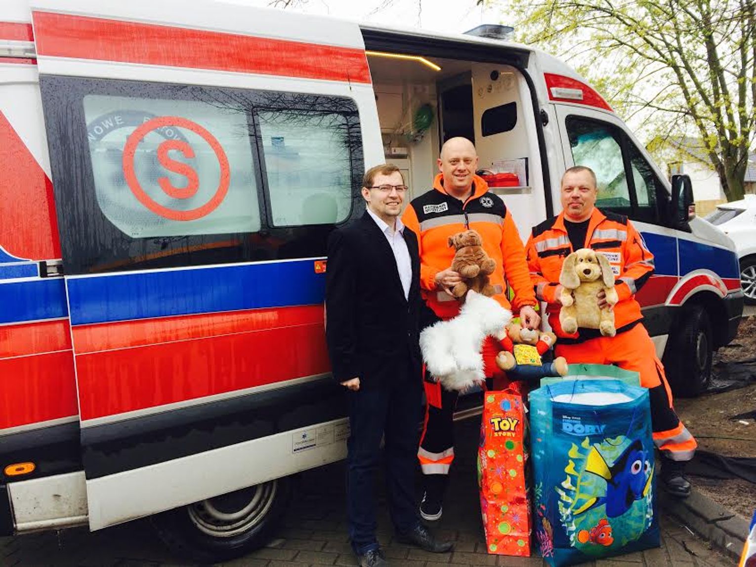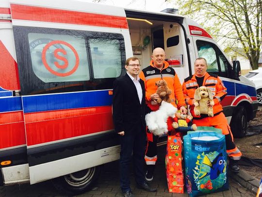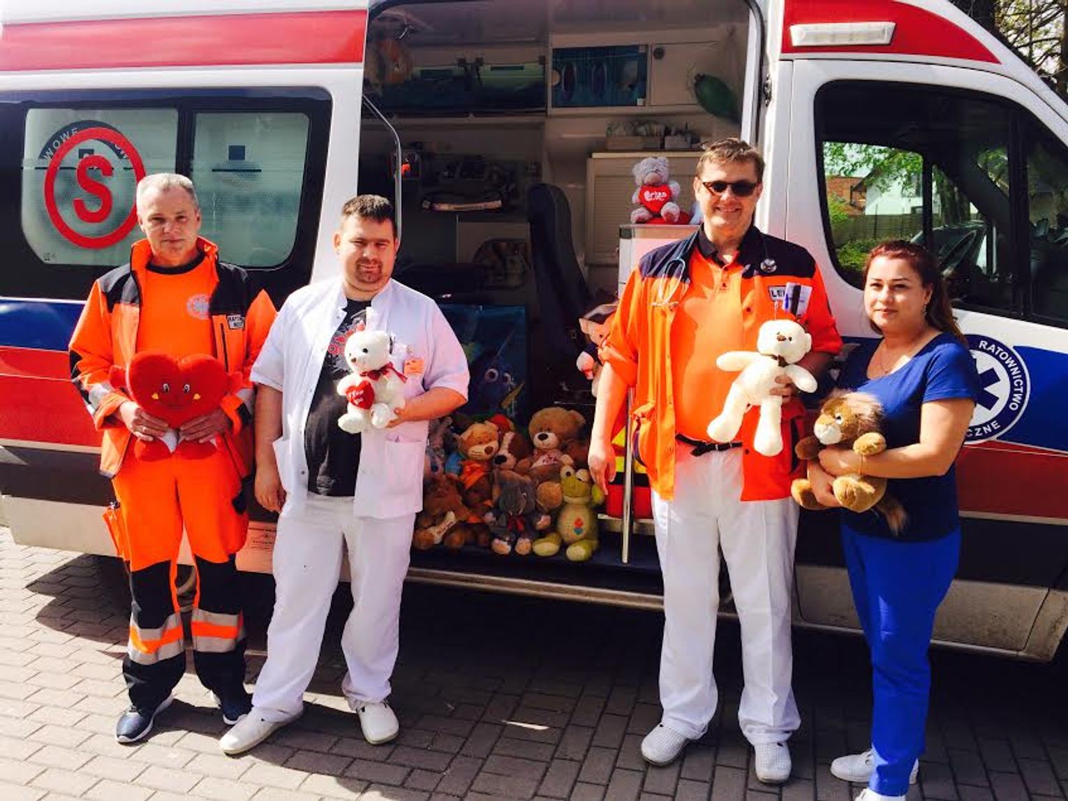 Misie trafiły do karetek dzięki zbiórce zorganizowanej przez Zakłady Farmaceutyczne POLPHARMA SA (podczas „Dni Otwartych POLPHARMY) oraz przez Andrzeja Grabowskiego ze Stowarzyszenia Młodzi Demokraci.