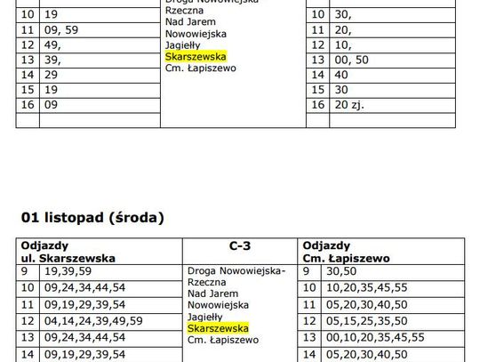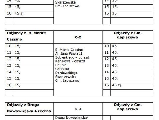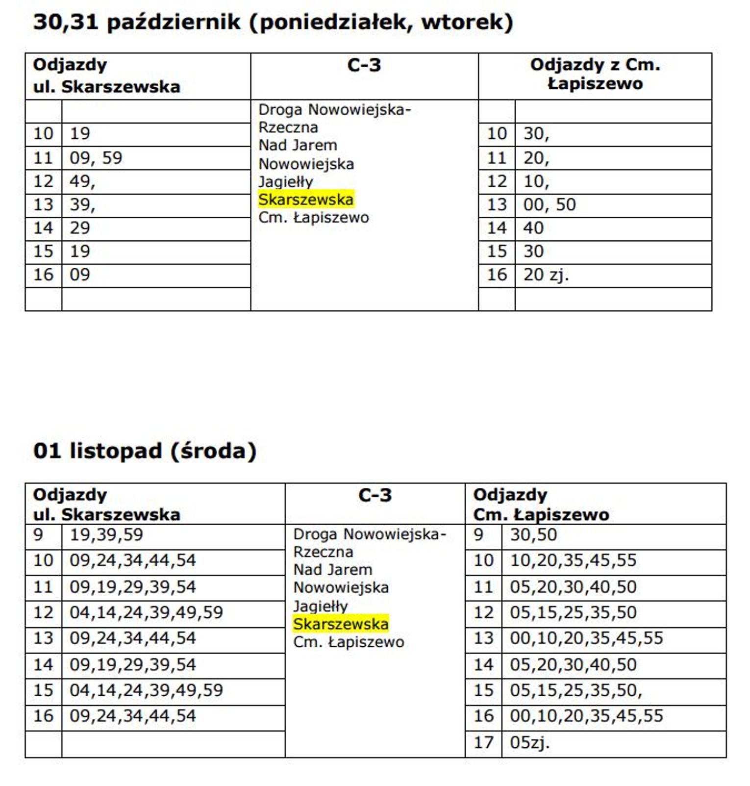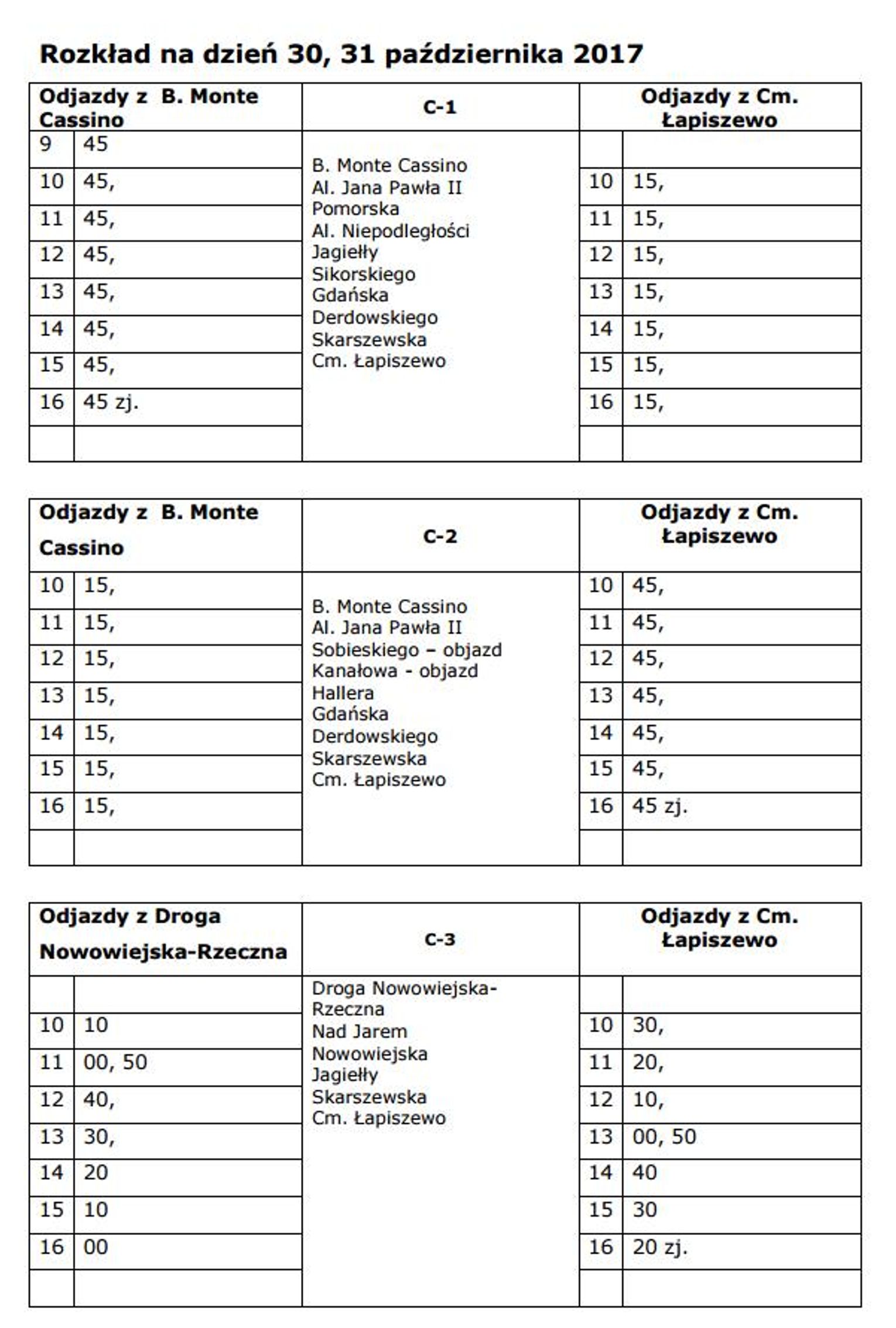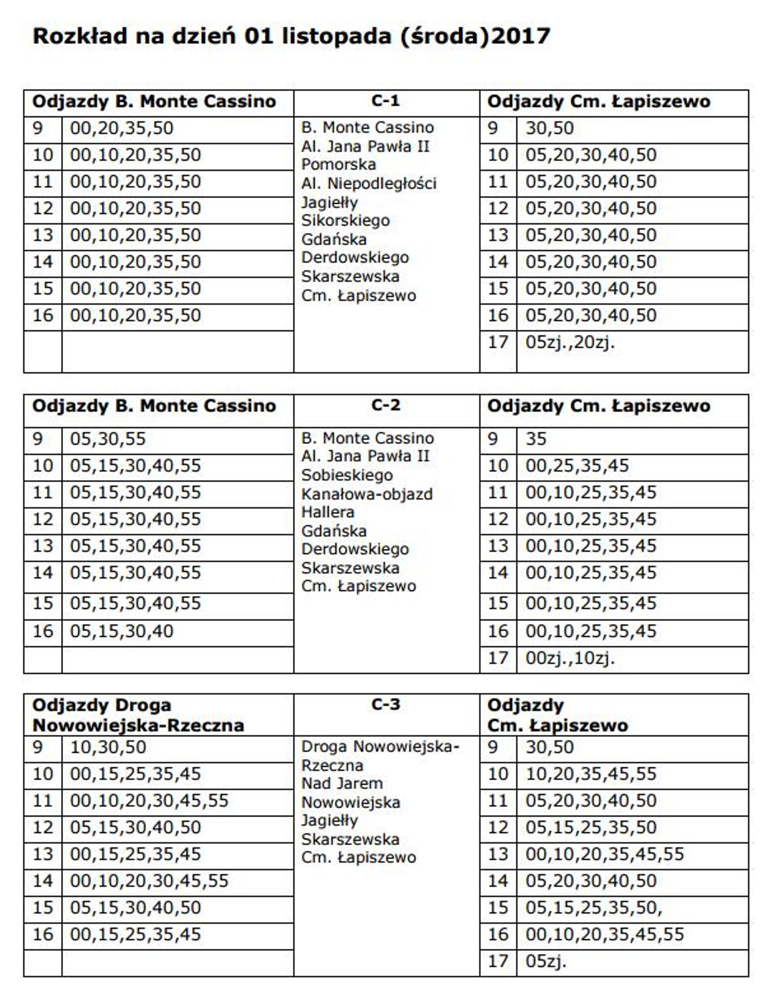 Autobusy zatrzymywać się będą na wszystkich przystankach po trasie oraz dodatkowo dla linii C-3 na ul. Skarszewskiej (przed przejazdem kolejowym). Szczegółowe informacje tel. 58 5623001, 02 (dyspozytornia)