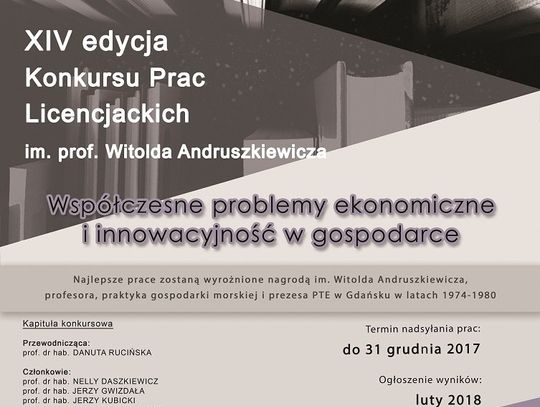 Do konkursów mogą być zgłaszane prace magisterskie i licencjackie napisane w języku polskim, poświęcone problematyce ekonomicznej i innowacyjności w gospodarce, które stanowiły przedmiot egzaminu dyplomowego w uczelniach publicznych i niepublicznych z terenu województwa pomorskiego, wypromowane w roku kalendarzowym, w którym została ogłoszona edycja konkursów. Składanie prac konkursowych wraz z rekomendacją promotora możliwe jest od września do końca grudnia 2017 r.