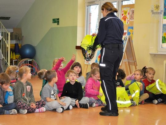 Podczas spotkania w ramach działań profilaktycznych pn. ,,Uczę się bezpieczeństwa”, funkcjonariuszka rozmawiała z dziećmi o bezpieczeństwie w ruchu drogowym, a w szczególności o tym dlaczego warto stosować elementy odblaskowe. Dzieci dowiedziały się również o zasadach bezpiecznego podróżowania rowerem, samochodem i autobusem.