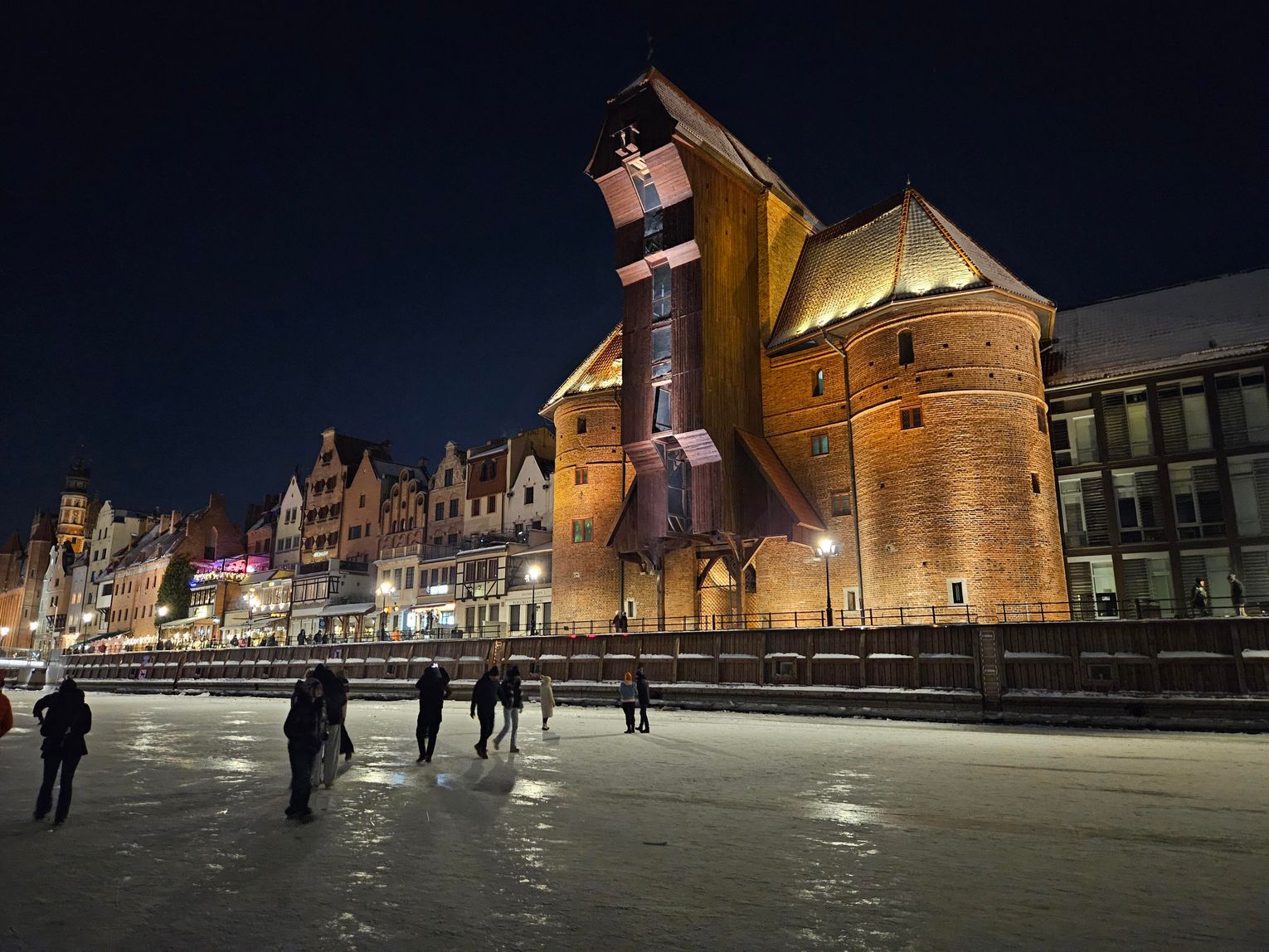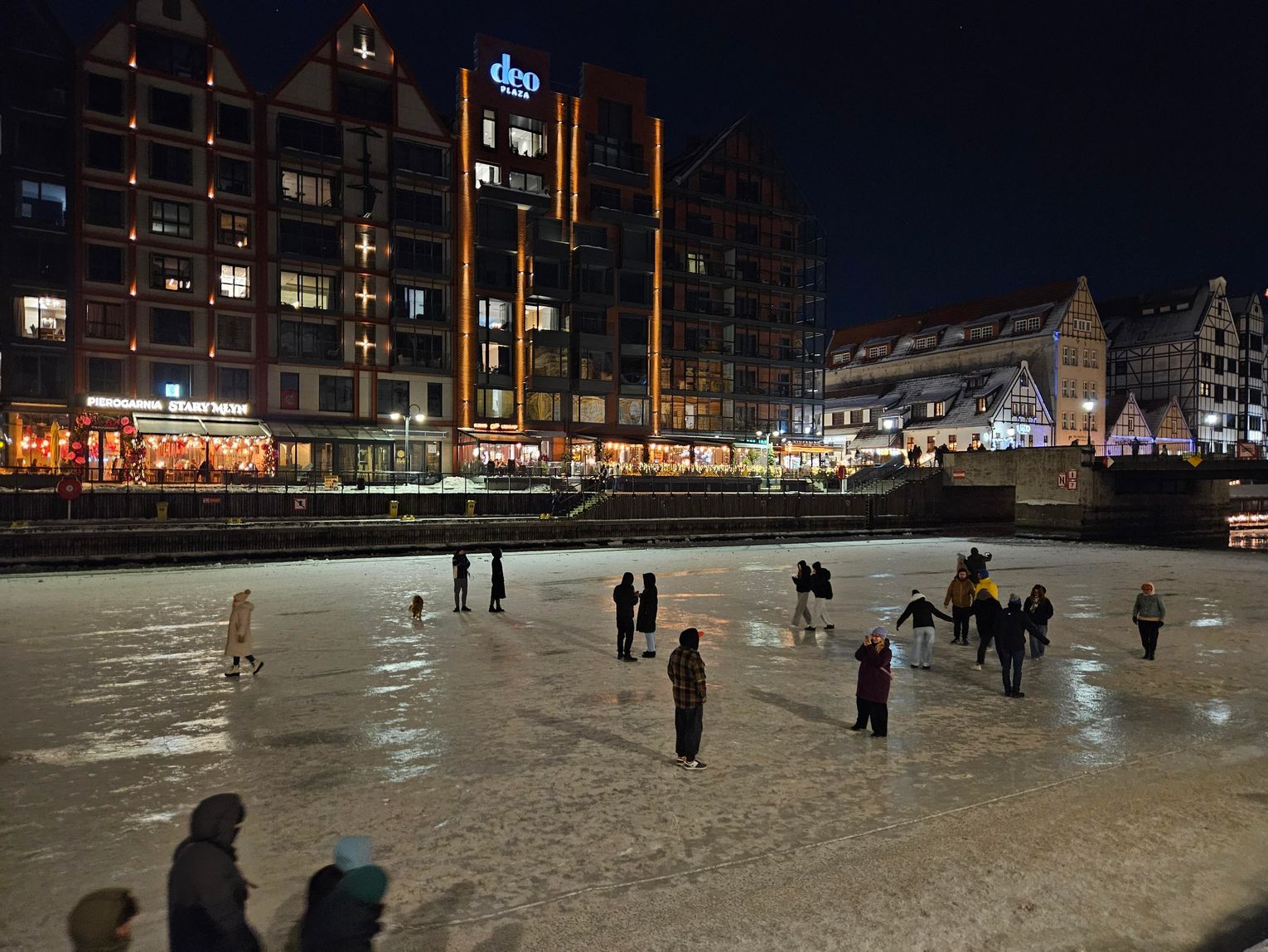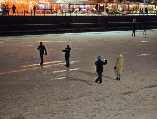 Ludzie wchodzą na lód, spacerują po nim, jeżdżą na łyżwach i fotografują się przy gdańskich zabytkach. Niektórzy traktują zamarzniętą rzekę jak naturalny „deptak”, inni organizują rodzinne spacery w niezwykłej scenerii.