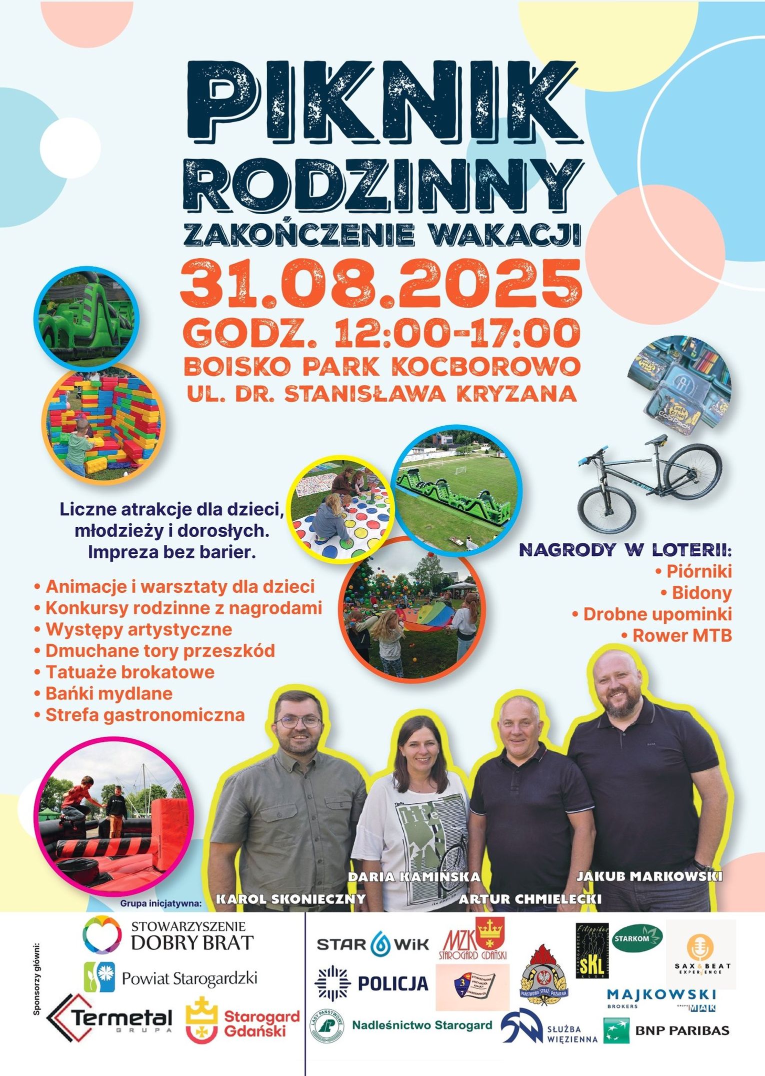 Na zakończenie wakacji Stowarzyszenie Dobry Brat wraz z partnerami zaprasza mieszkańców powiatu starogardzkiego i okolic na wielki Piknik Rodzinny. To wydarzenie przygotowane z myślą o dzieciach, młodzieży i dorosłych – impreza bez barier, pełna atrakcji i wspólnej zabawy.